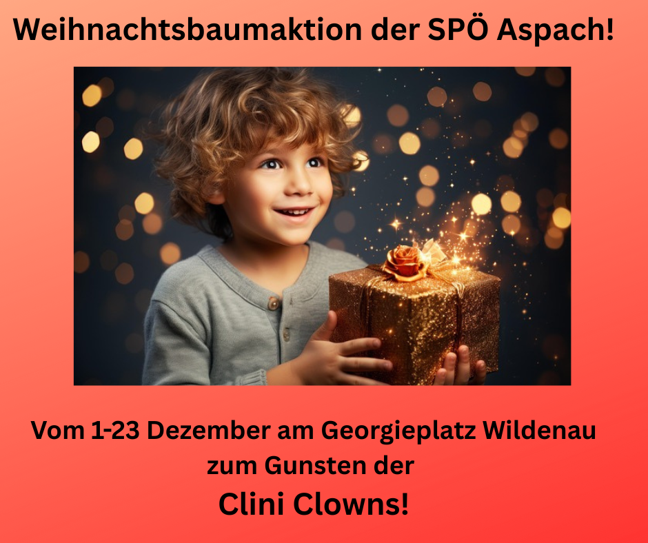 Unsere Weihnachtsbaumaktion geht in das 5 Jahr. Heuer sind die Spenderkärtchen für die CliniClows gedacht. Neu- man braucht die Kärtchen nicht mehr mit nach Hause nehmen. Ein QR Code erleichtert das Spenden. Herzlichen Dank für Eure Spende. SPÖ Aspach